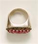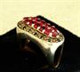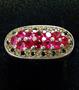 Starší prsten s velkou hlavou a 12 broušenými kameny, které jsou snad syntetické rubíny, a s 14 drobnými tmavými kameny (viz foto), stříbro 925/1000. Rozměr hlavy 2,4 x 1,3 cm, vnitřní průměr 1,8 cm, váha brutto cca 11 g, dobrý stav bez poškození, jen mírné známky stáří a používání.