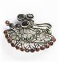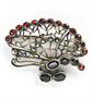 Stará secesní brož ze sterlingového stříbra s 19 červenými kameny (granáty nebo almadiny ?) a 11 zirkony, značeno 925 a neidentifikovaný punc na jehle (viz foto). Rozměr cca 3,3 x 4,2 cm, váha brutto 9,75 g, netto 8,1 g, dobrý stav bez poškození, běžné známky stáří a používání. Ryzost a váha potvrzeny puncovním úřadem.