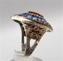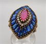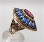 Opulentní prsten z 925 stříbra s barevnými kameny v indickém mughal stylu, možná i indické provenience, značeno 925. Velikost 59 / 18,8 mm, dobrý stav bez poškození, jen mírné známky stáří a používání.