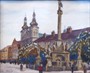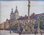 Olej na kartonu 19,5 x 23 cm. Signováno vlevo dole. Autor: Adolf Doležal (1898-1978) český malíř starobylých zákoutí města Hradec Králové a jeho okolí, známý též krajinomalbou oblasti Východních Čech. Pohled rušné Velké náměstí v Hradci Králové s barokním Mariánským (morovým) sloupem a kostelem Nanebevzetí Panny Marie. Široký klenutý stříbrný rám se sklem. Československo 1926 - 1930. Celkový rozměr s rámem 33 x 36,5 cm.
