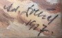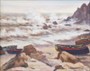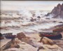 Olej na kartonu 18,5 x 22 cm. Signováno vpravo dole s datací 1927. Autor: Adolf Doležal (1898-1978) český malíř starobylých zákoutí města Hradec Králové a jeho okolí, známý též krajinomalbou oblasti Východních Čech. Rybářské bárky u skalnatého pobřeží s mořskými vlnami ve francouzské Normandii. Stříbrný široký rám se sklem. Francie, rok 1927. Celkový rozměr s rámem 32 x 36 cm.