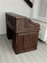 Americký psací stůl s roletou z meziválečného období, rozměry šířka 151 cm, hloubka 84 cm, výška pracovní desky 79 cm výška horní desky 117 cm. stůl by kompletně rozebrán a opět kus po kuse složen, slepen, přebroušen, namořen a navoskován. Lamely rolety byly podlepeny novým pevným plátnem, zámky byly restaurovány a byly k nim vyrobeny nové designové mosazné klíče. Stůl má vestavěno automatické zamykání zásuvek při zatažené roletě, má také dvě skryté zásuvky. Všechny části jsou plně funkční. Nedílnou součástí stolu je také zásuvková skříňka s 8 zásuvkovými vložkami a s roletou velmi podobného designu a stejné výšky. Její rozměry jsou šířka 50 cm, hloubka 45 cm, výška 117 cm. Tato je také po kompletním náročném restaurování včetně zámku a klíče, zásuvkových vložek a nově podlepené rolety. Jedná se o výjimečnou soupravu, která je v tomto technickém stavu a konfiguraci nesehnatelná. Cena je za oba kusy.