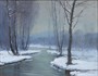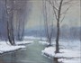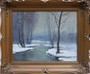 Olej na plátně 38 cm x 48 cm. Signováno vpravo dole. Autor: Antonín Augusta (1891-1940). Klidná vodní hladina řeky protékající zákrutami kolem břehů se vzrostlými stromy a krajinou pokrytou sněhem. V dobovém rámu s reliéfními vyřezávanými florálními ornamenty. Československo 1920 - 1935. Celkový rozměr s rámem 52 cm x 62 cm.