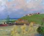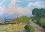 Olej na plátně 50 x 70 cm. Signováno vpravo dole. Idyla za slunečného dne s panáky obilí, husami sbírajícími klásky, oráčem na poli, cestou, odpočívající ženou s nůší trávy, pastevcem s kravičkami na horizontu. Originální rám francouzského typu s ozdobami, celkový rozměr 63 x 82 cm. Antonín Majer ( 1882 - 1963 ) . Čechy 1915 - 1930.