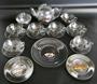 Art deco čajový servis a dezertní talířky.Sklo varné.Neznačeno.Zdobeno orientálním dekorem.Vše je v naprostém pořádku.Dezertní sada je 1 velký talíř 23.5cm a 6 malých talířku 16.5cm.Konvice 24cm x 16cm.Cukřenka a mlíčenka.6kusů šálků s talířky.