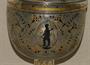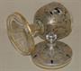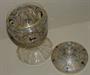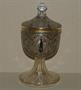 Pohár na noze s víkem, čiré sklo, noha broušená do fazet, kupa malovaná švarclotem, místy zlacení. Výška 23 cm, prvotřídní stav !! Výroba zřejmě severní Čechy, snad Kamenický Šenov. Kolem roku 1920.