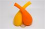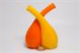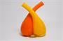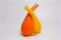 Neobvyklý pár karafek na olivový olej a ocet z výrazně barevného Tango skla. Zajímavá je dvoubarevná kombinace žlutého a oranžového skla na patce z čiré skloviny vespod zabroušené. Tvarem připomínají dvě navzájem propojené lahvičky kapkovitého tvaru. Sklo ve stylu ART - DECO z počátku minulého století. Dobrý stav stav, rozměr - v. 16 x 12 x 8cm