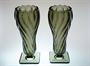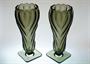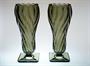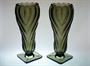 Vysoké vázy z topasového ručně lisovaného skla stojící elegantně na patce. Stylový pár váz ve výrazném tvarosloví ART - DECO má tvar uzavřeného květu s hlubokým reliéfem. Autorem návrhu je sklářský výtvarník Rudolf SCHRÖTER ( *1887 ) a provedla sklárna Josef INWALD Teplice ve 30tých letech minulého století. Dobrý stav, rozměr - v. 27cm, prům. 11cm