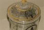Dóza z čirého skla, broušená do fazet, víčko i boky malované švarclotem - květy a děti. Zlacení.