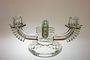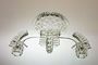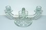 Prvotřídní dvouplamenný svícen z čirého ručně lisovaného skla stojící na patce. Čistý soliter ve stylu ART - DECO, autor návrhu pravděpodobně Rudolf SCHRÖTTER pro sklárnu Josef INWALD - Teplice. Dobrý stav bez poškození, rozměr - š. 27 x 13 x 13cm