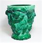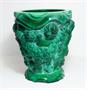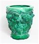 Větší masivní váza z malachitového ( Jade ) skla s velmi hlubokým figurálním reliéfem, motiv hrajících si dětí - Putti a květinové girlandy. Částečně matované, broušené a leštěné sklo ve stylu ART - DECO provedla Jizerskohorská krystalerie Curt SCHLEVOGT jako součást kolekce luxusního skla INGRID. Dobrý stav, rozměr - v. 19cm, prům. 17cm, hmot. 2,3kg