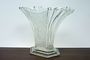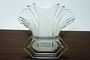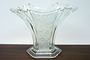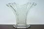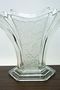 Stylová váza otevřeného vějířovitého tvaru z čirého ručně lisovaného skla stojící na stupňovité patce. Na obou stranách matovaný stylizovaný květinový reliéf. Provedly sklárny v severních Čechách po roce 1930. Dobrý stav, rozměr v. 21 x 27 x 14cm