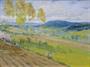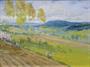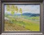 Olej na kartonu 26 cm x 33 cm. Signováno vpravo dole. Pohled do krajiny se svažitými políčky, loukami a břízami v popředí. Stříbrný rám s horním reliéfním ornamentem. Čechy 1915 - 1930. Celkový rozměr s rámem 31,5 cm x 38,5 cm.