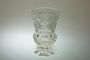 Sbírková skenice - pohárek s bohatým jemně řezaný ornamentem. Sklenice z čirého skla stojí na patce a broušený geometrický dekor je na celé ploše. Téměř 200 let staré luxusní sklo. Dobrý stav bez poškození, rozměr v. 14cm, prům. 8,5cm