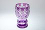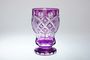 Sklenice stojící na patce pochází z období Biedermeieru - probrušované ametystové ( Lilla ) sklo, které je navrstvené na čiré sklovině a následně probrušované a řezané s dekorem hvězdiček, fazetek a olivek. Velmi dekorativní sklenice stylového tvaru, Čechy kolem roku 1850. Dobrý stav, rozměr v. 13,5cm, prům. 9cm