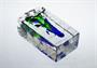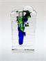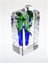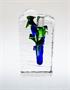 Masivní vázička na jeden květ - bloček taveného čirého skla se strukturovaným povrchem a v neobvyklém provedení s barevnou zataveninou v odstínu Oceanit a kobaltová modř. Autorem návrhu z roku 1972 je sklářský výtvarník a šperkař Václav HANUŠ (*1924 +2009), provedení Jablonecké sklárny. Dobrý stav, rozměr - v. 15 x 7 x 5cm