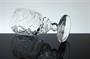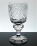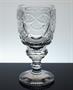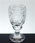 Bohatě broušená a řezaná sklenice z čirého skla, stojící na nožce celoplošně dekorovaná geometrickým ornamentem. Patka je po obvodu řezaná do drobných fazetek, na kalichu je prázdný medailon připravený na případnou drobnou rytinu ( erbu, monogramu, či portrétu ). Číška z první poloviny 19. století - období Biedermeier je dokladem bravurní práce brusičů skla. Dobrý stav, rozměr v. 15,5cm, prům. 8cm