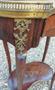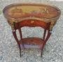 Bohatě intarzovaný stolek v nalezovém stavu. Rozměr 52,5x29cm, výška 74,5 cm