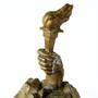 Stará masivní velmi těžká (kolem 20 kg, jeden člověk taktak zdvehne) schránka na hodiny z bronzu s plastickou rukou držící pochodeň, nejasné co má jako symbol znamenat. Výrobce neznám, neznačeno, stáří patrně první polovina 20. století. Výška cca 40 cm, celkově dobrý stav bez poškození, běžné známky stáří a používání, na straně stará stabilní prasklina patrně z výroby, funkčně bezvýznamná.