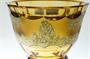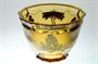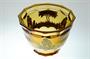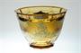 Honosná fazetově broušená váza z masivního ambrového skla bohatě zušlechtěná zlacením a perokresbou s figurálním motivem z antické mytologie. Dekorativní váza z druhé poloviny minulého století, půvabná práce brusičů a malířů skla. Dobrý stav, rozměr v. 12cm, prům. 16cm,