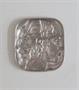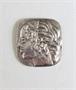 Brož tvaru zaobleného obdélníku, s reliéfní dívčí hlavou z profilu. Tepaný bílý kov. Styl. Jaroslav Horejc. Kol 1925. Výška 5,7 cm, šířka 5,3 cm.