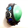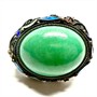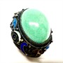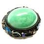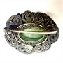 Oválná, stříbrná brož osazená velkým tyrkysem. Kámen rámuje zdobný filigránový rámeček zdobený barevnými smalty. Stříbro ryzosti 925/1000, celková váha 12,15 g. Rozměry cca 3 x 2 cm. Výborný stav.