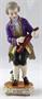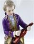 Bílý, malovaný a zlacený porcelán. Soška stojícího chlapce se zapřenými houslemi o jeho stehna. Oblečený v rokokovém šatě s fialovým kabátem. V zadní části položené knížky s notami. Kulatý rokokově tvarovaný podstavec s reliéfním zlaceným ornamentem. Značeno zespodu : modrý úl, vtlačená biskupská berla, A 500, ručně psané číslo malíře 4. Restaurováno. Dressel, Kister & Co., Passau. Německo od roku 1908. Výška 14 cm.