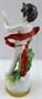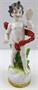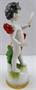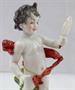 Bílý, ručně malovaný, barevný a zlacený porcelán. Aelteste Volkstedter Porcellanmanufaktur. Stojící nahý chlapec s pruhem vlající červené látky spojené zlatým pásem okolo jeho beder. Prohlížející sám sebe v malém zrcátku, které drží v levé ruce. Vysoký klenutý podstavec se zelenými listy a zlatým ornamentálním spodním pásem. Značeno zespodu: modrá splétaná písmena s korunkou. Německo 1915-1935. Výška 16 cm.