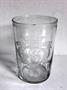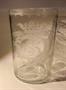 Válcovitá číče, čiré sklo, s řezaným medailonem s monogramem SS. Horní okraj s řezanými závěsy s mřížkou, se 2 oťuky, spodní okraj s broušenými olivami. Ve sklovině 2 bílé kamínky. Výška 11,3 cm, průměr 7,5 cm. Kol 1770.