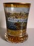 Číše na zoubkované noze, konická, čiré sklo, transparentní malba, pohled na přístav Terst s vojenskou hlídkou (n. Triest, it. Trieste), žlutě lazurovaná nápisová páska Ansicht der Stadt Triest , rám výjevu a horní okraj žlutě lazurovaný, horní okraj zkosený vně i uvnitř, zlacený, s drobnou chybou v hraně, zlatý vlys rozvilin ve způsobu A. Kothgassera, ve dně broušená hvězdice s 16 paprsky, žlutě lazurovanými. Po roce 1813, kdy Rakousko získalo Terst zpět, držený přechodně italským královstvím (obdobné číše z té doby jsou opatřeny nápisem a Veduta della Citta di Trieste'), v, 10.8 cm, průměr 8,1 cm. Kulturní zajímavost: V Terstu se narodil 1840 architekt Julius Hofmann, pozdější vedoucí malírny skla v Mnichově.