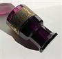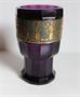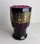 Těžká číše na duté noze, silnostěnné fialové sklo, broušené do 12 hran, leptaný a zlacený vlys. Ploché zabroušené dno, lehce uštípnuto na okraji. Výška 14,5 cm. Kol 1915. Výška a tvar připomíná sklárnu Loetz, střih III-533, 12 thlg. geschält.