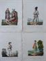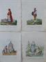 Barevné ručně kolorované litografie. Costumes dela la Monarchie Autrichiene Dessinés par Kieninger. Autoři: Vincenz Georg Kieninger ( 1767 - 1851 ), Wilhelm Fridrich Schotterbeck ( 1777 - 1819 ). Publies á Vienne Chez Tranquillo Mollo ( 1767 - 1837 ) Vydavatel a obchodník s uměním. Osm akvarelem ručně kolorovaných litografií s námětem tradičních místních oděvů v různých zemích Rakovského císařství: Chorvatské ženy, Rolník z Marmárošského palatinátu v Uhrách, Polska židovka, žid s Mukačeva, Kopaničár na Moravských hranicích s Maďarskem. Venkovská dívka z okolí Mantovy Itálii, Maďarští sedláci z okolí Peště v Uhrách, Selka z údolí v Tyrolsku. Číslované paginací v pravém dolním rohu. Místy zažloutlé listy, malé skvrny na papíru, čárka perem na jednom listu. Vídeň 1803 - 1821. Celkový rozměr jednotlivých listů 31x24 cm.
