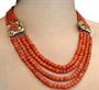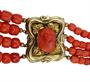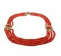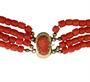 Čtyřřadý korálový náhrdelník se zlatým uzávěrem a a zlatými dělícími aplikacemi osazenými korálovou kamejí. Zlato ryzost 585 a 460/1000, Délka náhrdelníku 44 cm. Korálky červeného korálu navlečené na náhrdelníku jsou soudkovitého tvaru. Osvědčení Puncovního úřadu.