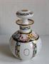 Kulovitý flakon s krátkým hrdlem a roztočeným ústím, se zátkou. Čiré sklo, impregnováno bílým emailem, s pestrou malbou květů v kruhových a svislých polích. V. 13,5 cm, průměr v těle 9,5 cm. Kol 1910.