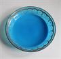 Miska kruhové těla s prohnutýmj okrajen. Opálově modré sklo s reliefním zlaceným dekorem povrchu. Kol 1850. Průměr těla 22 cm, výška 3,5 cm.