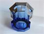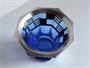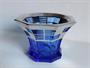 Osmiboká váza na osmiboké patce, modré sklo, broušené. Galvanoplastický stříbřené, s motivem čtverce. Výška 8,9 cm, horní vnitřní průměr 10,8 cm. Kol 1915-1920. Stopy používání na dně.