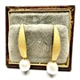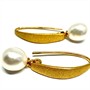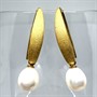 Designové, závěsné náušnice zhotovené ze silně zlaceného stříbra sterlingové ryzosti (925/1000). Povrch náušnic zdoben jemným matem. Kinetický ověs v podobě sněhobílé perly dodává náušnicím jemný půvab. Váha 3,88 g. Délka 3,3 cm, Perfektní stav.