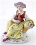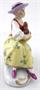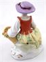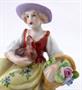 Bílý, barevný, malovaný a zlacený porcelán. V rokokovém stylu. Sitzendorfer Porzellanmanufaktur, Sitzendorf, Německo. Porcelánová soška sedící dívky v kloboučku držící v náručí slepičku a v druhé ruce košík s růžemi. Oválný rokokově tvarovaný podstavec se zlatými konturami. Značeno zespodu: modrá koruna, písmeno S, číslo malíře. Německo od roku 1918. Výška 7 cm, šířka 6,5 cm.