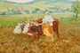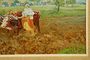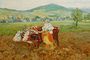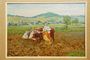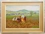 Krajinka v popředí s mladou krojovanou dívkou vedoucí pár volků. Olej na plátně fixovaném na karton, kvalitní malba od neznámého autora - monogramista K ( signováno p.d. ) Rámováno, dobrý stav ihned k vystavení do interiéru. Celkový rozměr 63 x 47cm, rozměr díla - 49 x 33cm