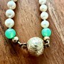 Elegantní, nadčasový náhrdelník z bílých perel se zlatým zapínáním. Perly jsou kontrastně proloženy chryzoprasy rozdílných velikostí. Šperk byl zhotoven ve stylu Art deco v první polovině 20.století a díky úctyhodné délce 102 cm může být nošen vícero způsoby. Perly jsou precizně prouzlíkovány. Náhrdelník je zakončen zapínáním ze 14ti karátového zlata (585/1000) v podobě kuličky zdobené gravírováním. Celková váha šperku 35,17 g. Přístavky z obecného kovu. Ke šperku je zhotoveno osvědčení Puncovního úřadu.