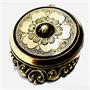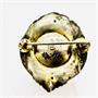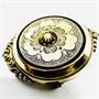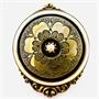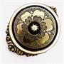 Půvabná brož zhotovená ve stylu biedermeier. Šperk byl vyroben ze silně zlaceného kovu, tzv. double. Přední část zdobena ručním rytím do tvaru květu, střed osazen bílou, říční perlou. Průměr 2,7 cm. Vyhotoveno osvědčení Puncovního úřadu. Perfektní stav.
