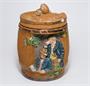 Secesní líbivá dóza na tabák s velice hlubokým reliéfem s motivem dvou pijáků piva. Víko dózy má po vnějším obvodu oťuky ( viz 2 posl. foto ) na samotné dóze je nepatrný oťuk na lemu klobouku sedícího pána ( lze jistě odborně restaurovat ). Dóza na tabák pochází z počátku minulého století, signované pouze vtlačeným číslem 32 38. Pravděpodobně se jedná podle použitého motivu a materiálu o výrobek manufaktury Ferdinanda MARESCHE z Ústí nad Labem. Rozměr - v. 17cm, prům. 12cm
