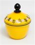 Dózička provedená z výrazně barevného Tango skla, na víku má florální vypalovaným smaltem malovaný dekor a kuličku z černého hyalitového skla. Počátek minulého století, práce sklářů ze Šumavy, nebo z pohraničí severních Čech. Dobrý stav, rozměr - v. 13cm, prům. 10cm