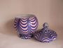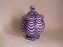 Dóza na noze s víkem (bonboniéra). Mléčně bílé sklo s česaným dekorem z červených a modrých nití, na dně nezabroušený přílep. Dóza výška 11 cm, průměr nohy 8 cm, celková výška s víkem 17,5 cm. Čechy, Harrachov (?), kol 1860.