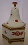 zlacený spodní a horní zaoblený okraj-lem,po bocích malované art-dekové stylizované florální ornamenty.Odjímatelné víčko zvonkovitého tvaru,nahoře s červeným držátkem-knoflíkem,zdobené též