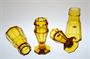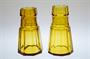 Celoplošně broušené do fazet a leštěné párové vázičky uzavřeného tvaru na drobné kvítky z ambrového skla v kubistickém tvarosloví. Krásně barevné sklo s dochovanými původními nálepkami (Made in Czechoslovakia), dvě z nich stojí elegantně na masivní patce. Provedly sklárny v severních Čechách v první třetině minulého století. Dobrý stav, rozměr - v. 13cm a v. 12cm