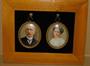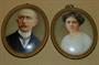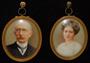 Dvojice maleb na porcelánu - každý portrét s rámečkem 9,5x7,5 cm, nesignováno, vzadu oba označeny papírovou nálepkou Kunstinstitut für Porzellan-Malerei Merkel Heine Wiesbaden.