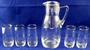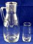Bezbarvé sklo, stříbro. Styl a období první poloviny minulého století. Vysoký džbán kónického tvaru s trojúhelníkovitým úchytem, zúženým hrdlem, stříbrným okrajem a nálevkou. Válcovité skleničky s horním okrajem zdobeným stříbrnou linkou. Pět skleniček. Československo 1930-1950. Výška džbánu 28,5 cm, výška skleniček 13,5 cm.
