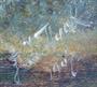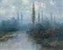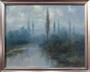Olej na kartonu 22x27 cm. Signováno vpravo dole, datováno 1907. V symbolistní náladě se secesní jemnou pastelovou barevností. Náladová melancholická krajina za mlžného oparu s motivem řeky a břehy porostlými křovím se stromy. Nový stříbrný rámeček. Evropa rok 1907. Celkový rozměr s rámečkem 24x30 cm.