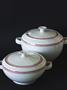 Stará jídelní souprava pro 12 osob z porcelánu dekorovaného na glazuře, návrh 1931 Arthur Hennig, profesor na Státní odborné keramické škole v Bunzlau, pro porcelánku Friedrich Kaestner, Oberhohndorf (cca 35 km jihozápadně od Chemnitzu), Sasko, model 530 Deutsche Form, dekor 1763, značeno zespodu zelenou značkou. Sestává z 59 kusů: 12 hlubokých a 12 plochých talířů (průměr 24 cm), 12 talířků (p. 19 cm), 12 misek (p. 11,5 cm), 1 teryná na polévku (p. 22 cm), 1 teryna na zeleninu (p. 20 cm), 1 omáčník, 2 hluboké mísy, 2 hluboké misky, 2 oválné tácy, 2 obdélníkové malé tácy. Váha celkem kolem 20 kg, vejde se do dvou krabic od banánů, kvůli nadglazurnímu dekoru by nemělo být umýváno v myčce. Celkově velmi dobrý stav bez poškození, oťuk na držáku pokličky teryny na zeleninu (viz foto), drobný oťuk zespodu na dolním ráfku omáčníku, dekor na několika málo místech nepatrně otřen, běžné známky stáří a používání. (745)
